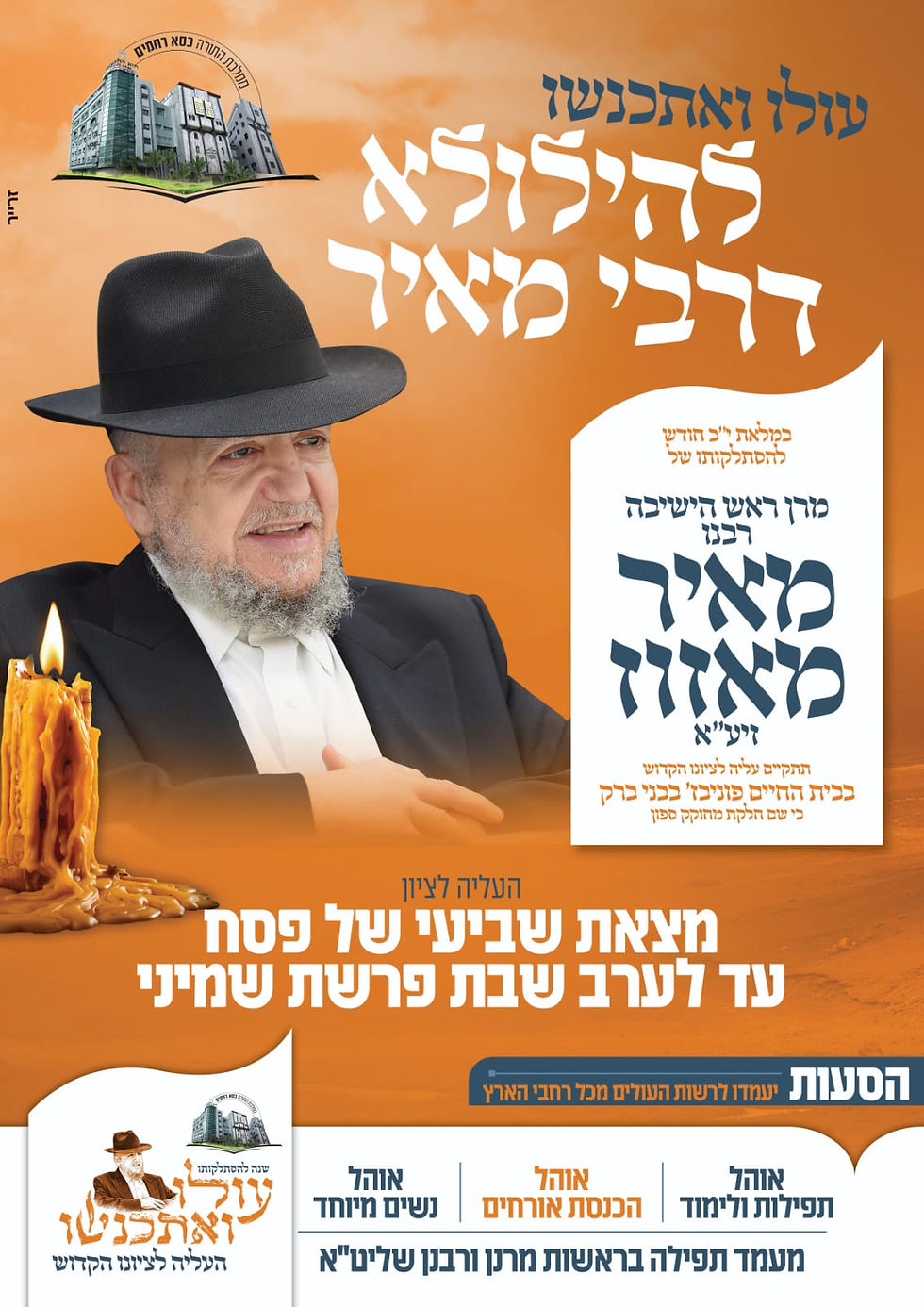 העליה לציון הקדוש בבית העלמין "פוניבז" בבני ברק, תתקיים אי"ה בימים חמישי ושישי, החל מצאת חג שביעי של פסח ועד לכניסת שבת פרשת שמיני.